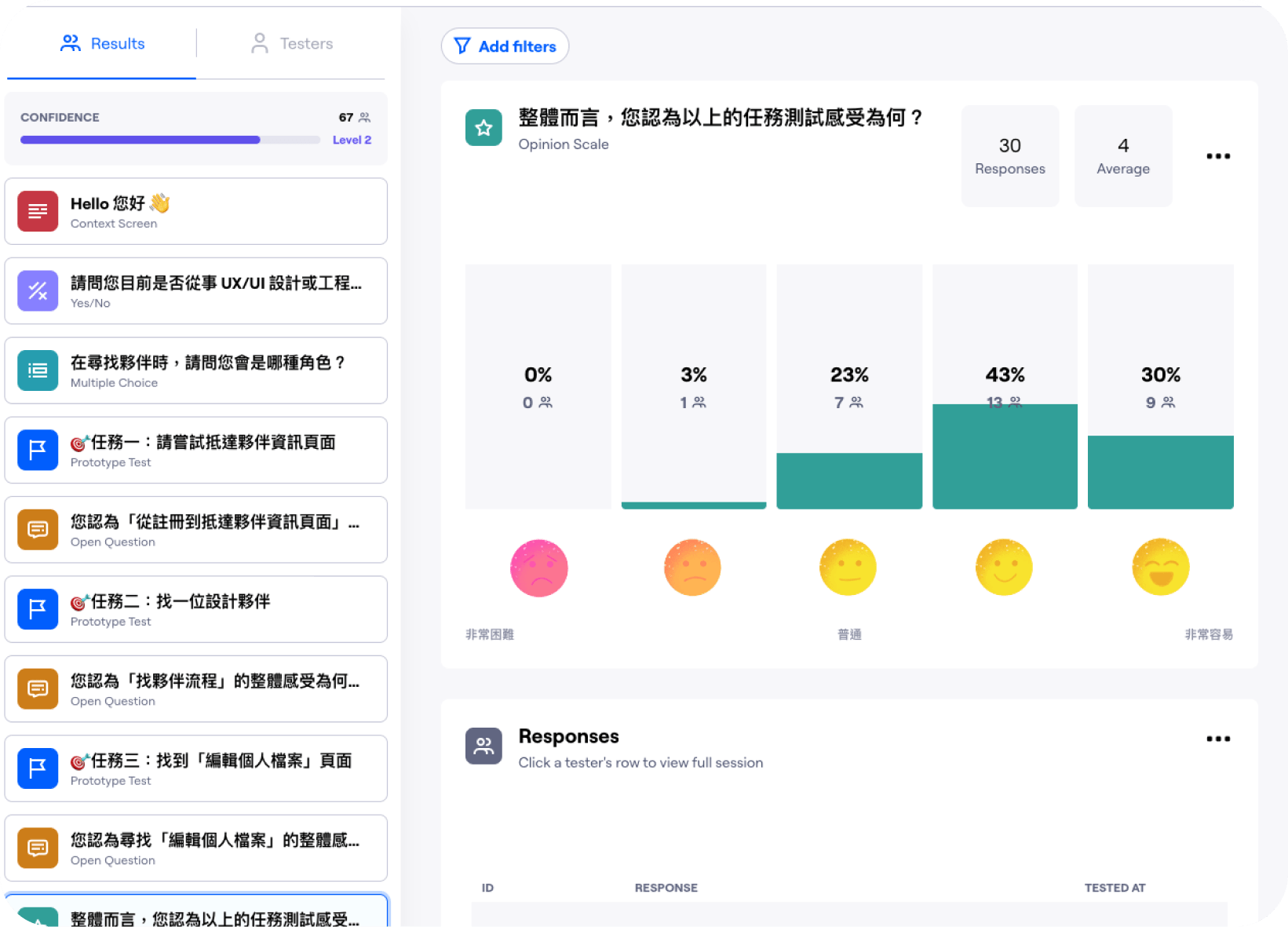 We designed 3 prompts and followed with open-end questions, and 30 of our previous respondents completed our unmoderated usability testing through Maze.